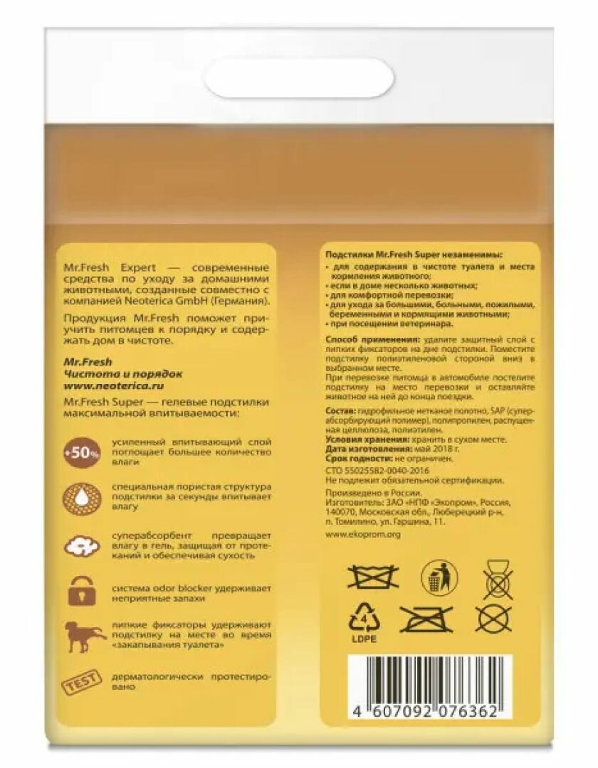 Пеленки впитывающие гелевые для животных с липким фиксатором MR. FRESH EXPERT SUPER 60 х 60 см (8 шт)