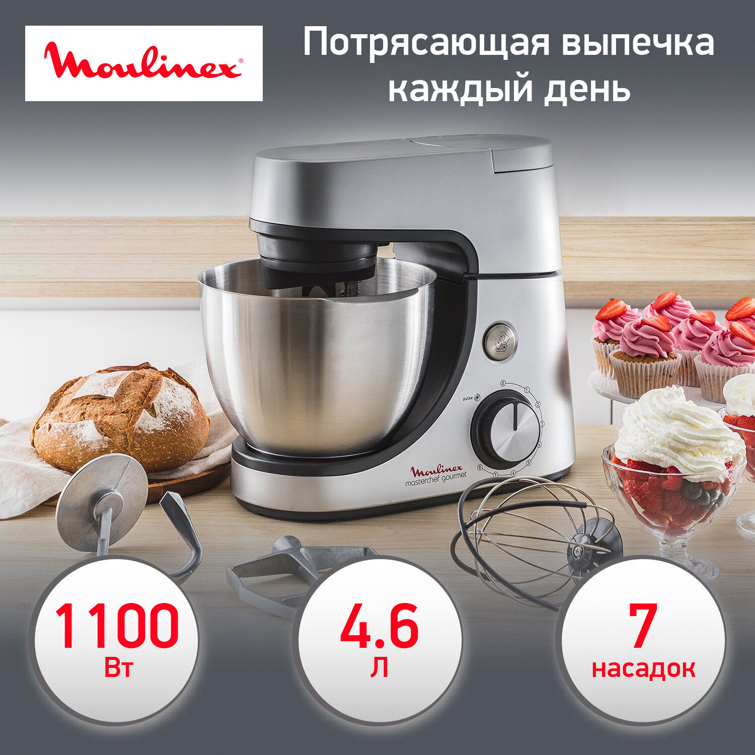 Кухонная машина Moulinex Masterchef Gourmet QA519D32, мощность 1100 Вт, металлическая чаша 4.8 л, 8 скоростей, функция Pulse, планетарное смешивание