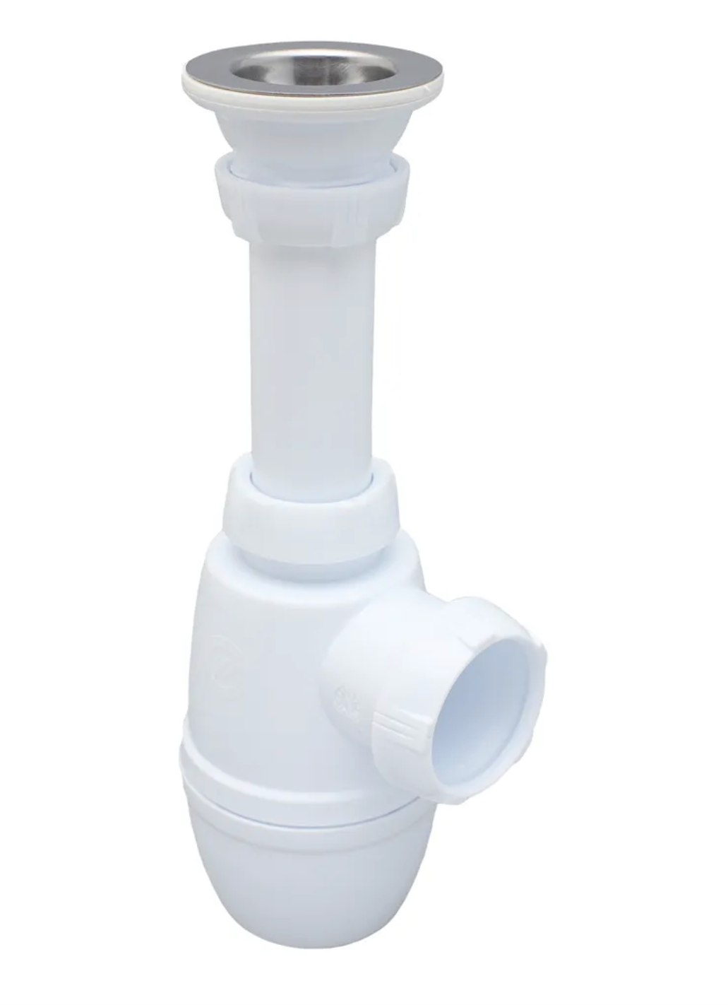 Сифон для мойки большая горловина с переливом, с отводом под сливной шланг и со съёмной корзинкой для мусора