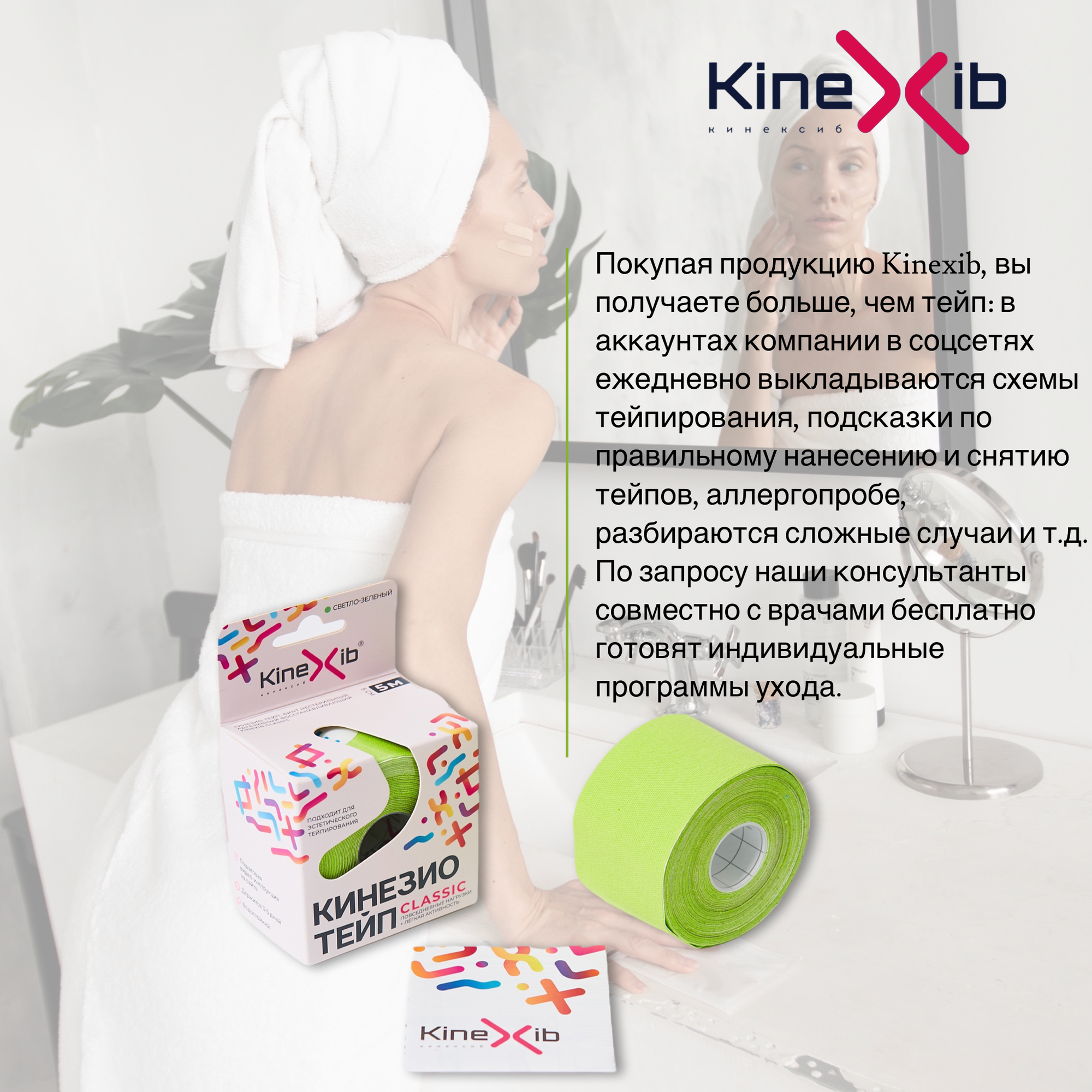 Купить Кинезио тейп Kinexib CLASSIC, тейпы для тела, тейп для лица 5м*5см, зеленый