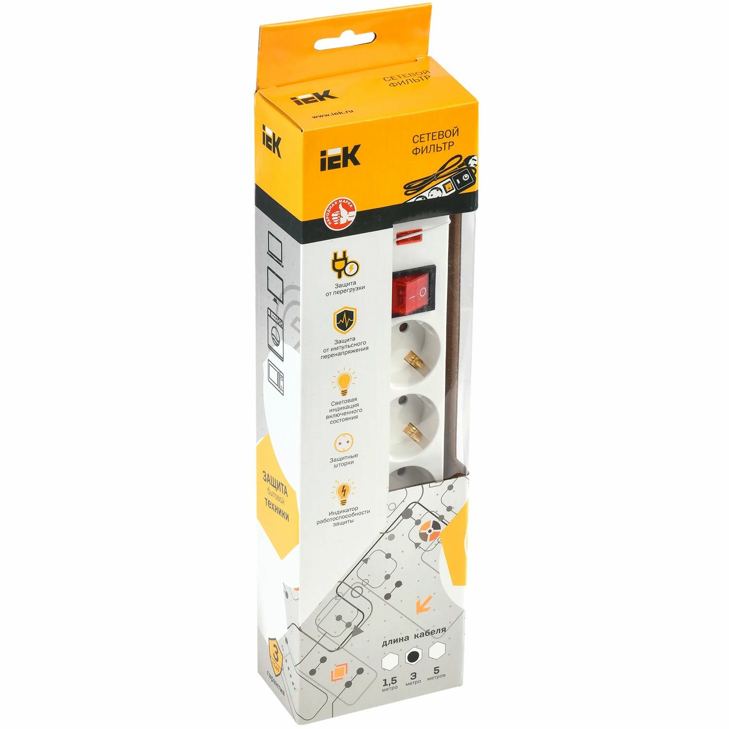 Сетевой фильтр СФ-05К-выкл. 5 мест 2P+PE/3метра 3х1мм2 IEK