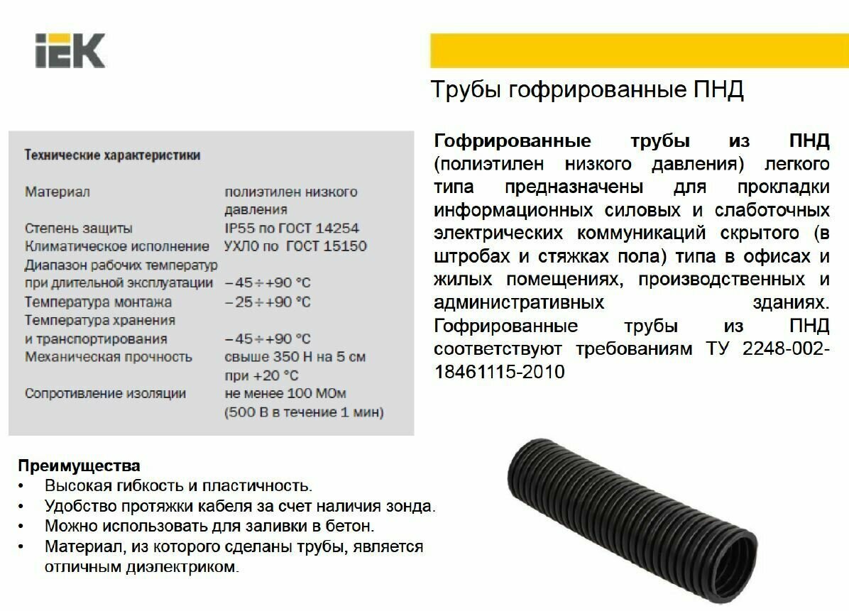 СохранитьТруба гофрированная Iek ПНД d16мм с протяжкой черн. (уп.50м) CTG20-16-K02-050-1 интересное: