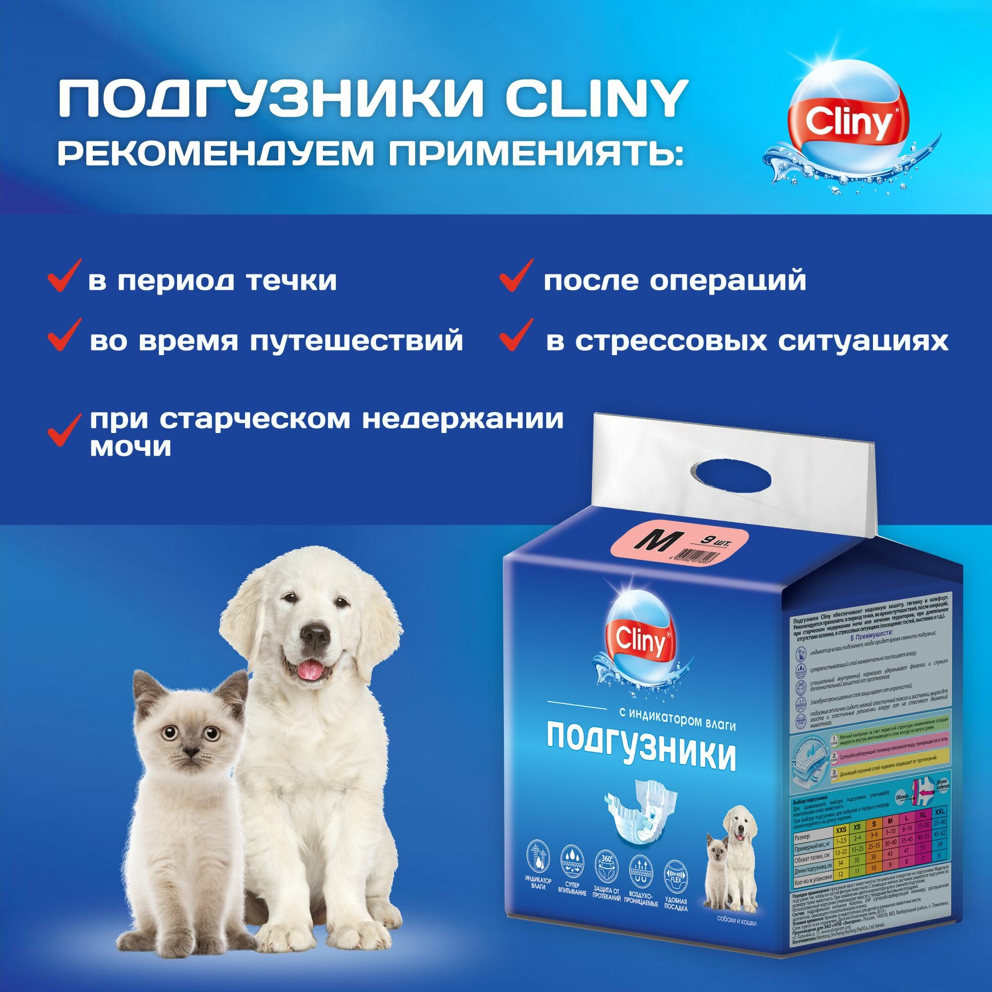 CLINY Подгузники М ( 5-10кг) для собак и кошек, 9шт./уп.