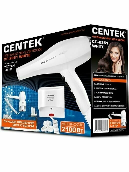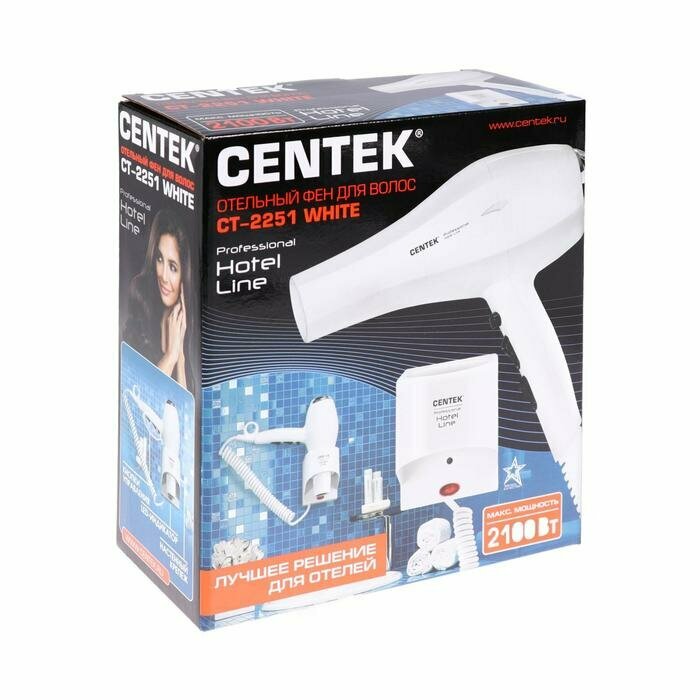 Фен Centek CT-2251, 2100 Вт, 3 скорости, 2 температурных режима, настенный, белый Centek 3815834 .