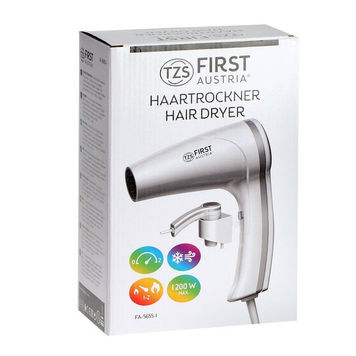 FIRST Фен FA-5655-1 Фен, 1200 Вт, шнур 2 м, крепл.на стене, 1 скор, 2 темп., холод, White