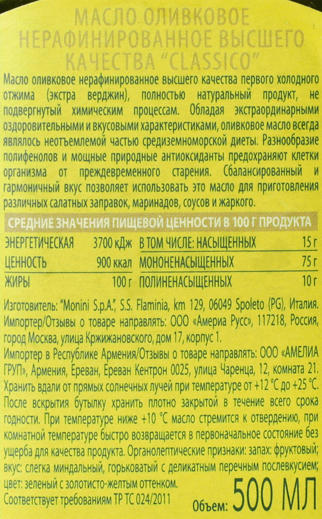 Оливковое масло MONINI, Classico, нерафинированное высшего качества (Extra Virgin), ст/б, 500 мл