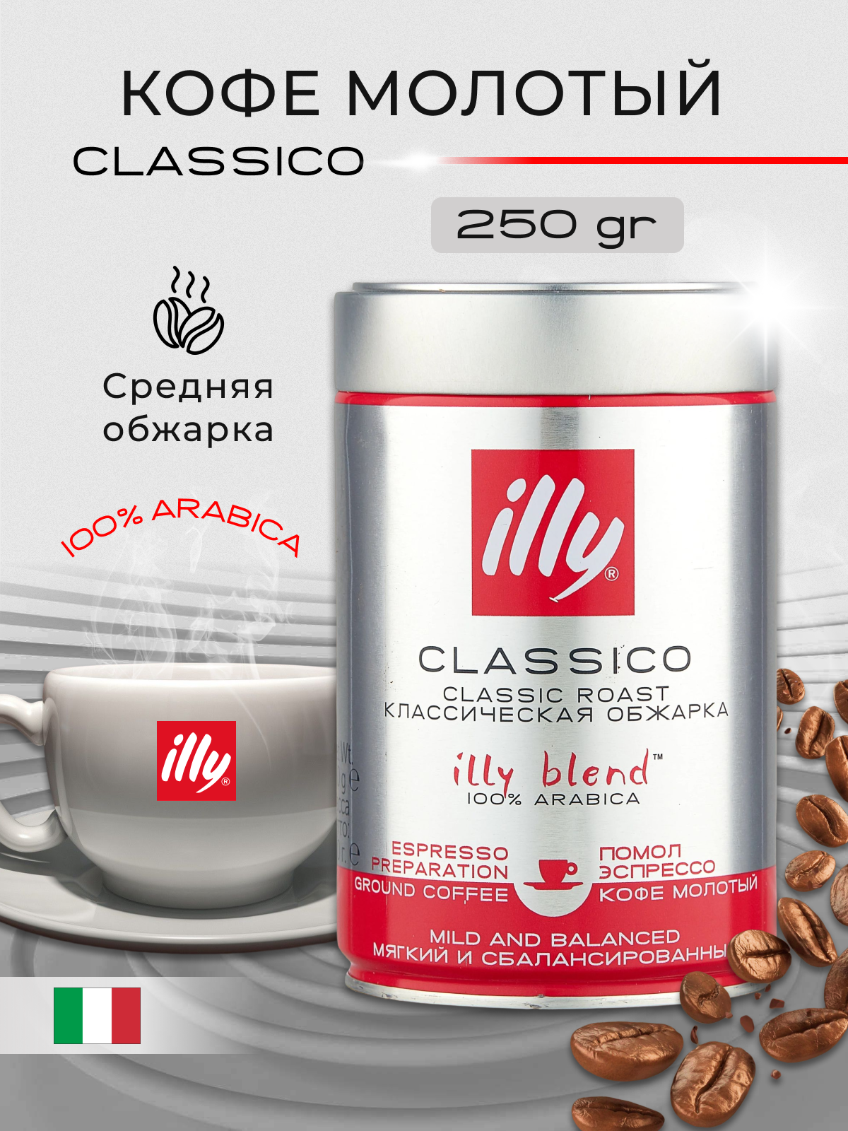 Кофе молотый ILLY "Classico" 250 г в жестяной банке, арабика 100%, италия, 43