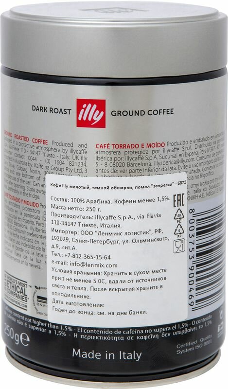 Кофе молотый ILLY "Intenso" 250 г в жестяной банке, арабика 100%, италия, 46
