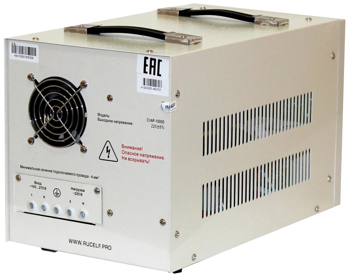 Стабилизатор напряжения однофазный RUCELF СтАР-10000 белый 10000 ВА 7000 Вт 460 мм 270 мм 300 мм 15.2 кг