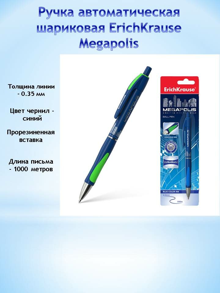 ErichKrause Ручка шариковая автоматическая Megapolis Concept, резиновый упор, узел 0.7 мм, чернила синие, длина линии письма 1000 метров, в блистере