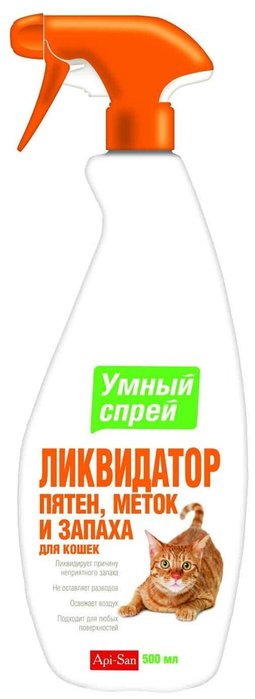 Спрей для содержания питомцев Apicenna Умный спрей Ликвидатор пятен, меток и запаха для кошек, 500 мл