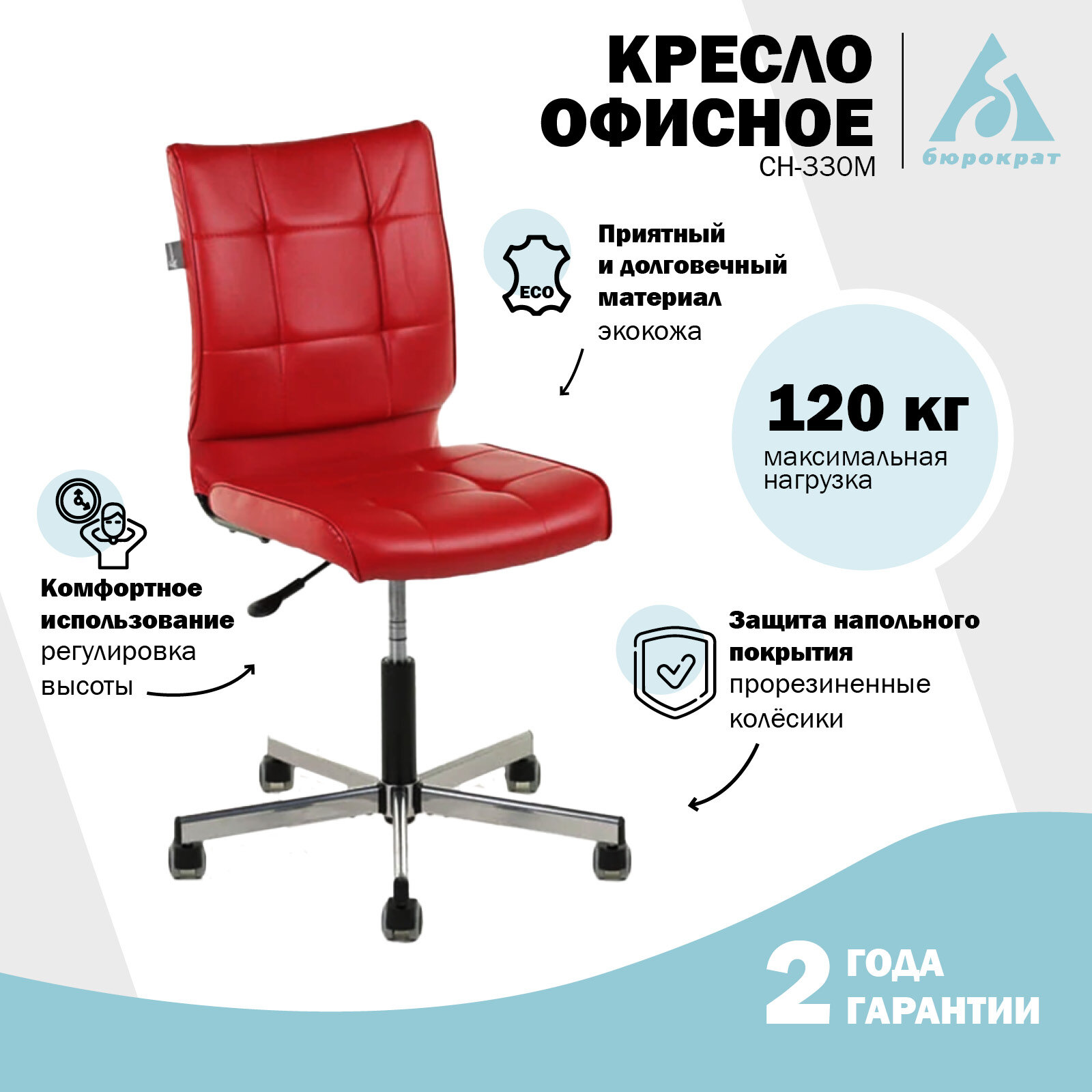 Кресло компьютерное Бюрократ CH-330M, стул на колесиках без подлокотников, низкой спинкой, экокожа, красный
