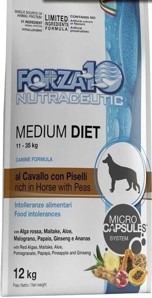 Сухой корм для собак Forza10 Diet, при чувствительном пищеварении, гипоаллергенный, конина, с горошком 12 кг (для средних пород)