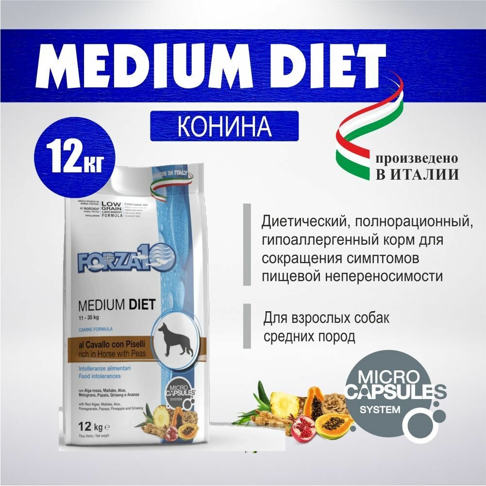 Корм Forza10 Diet Medium (гипоаллергенный) для собак средних пород при пищевой аллергии, конина и горох (с микрокапсулами), 1,5 кг