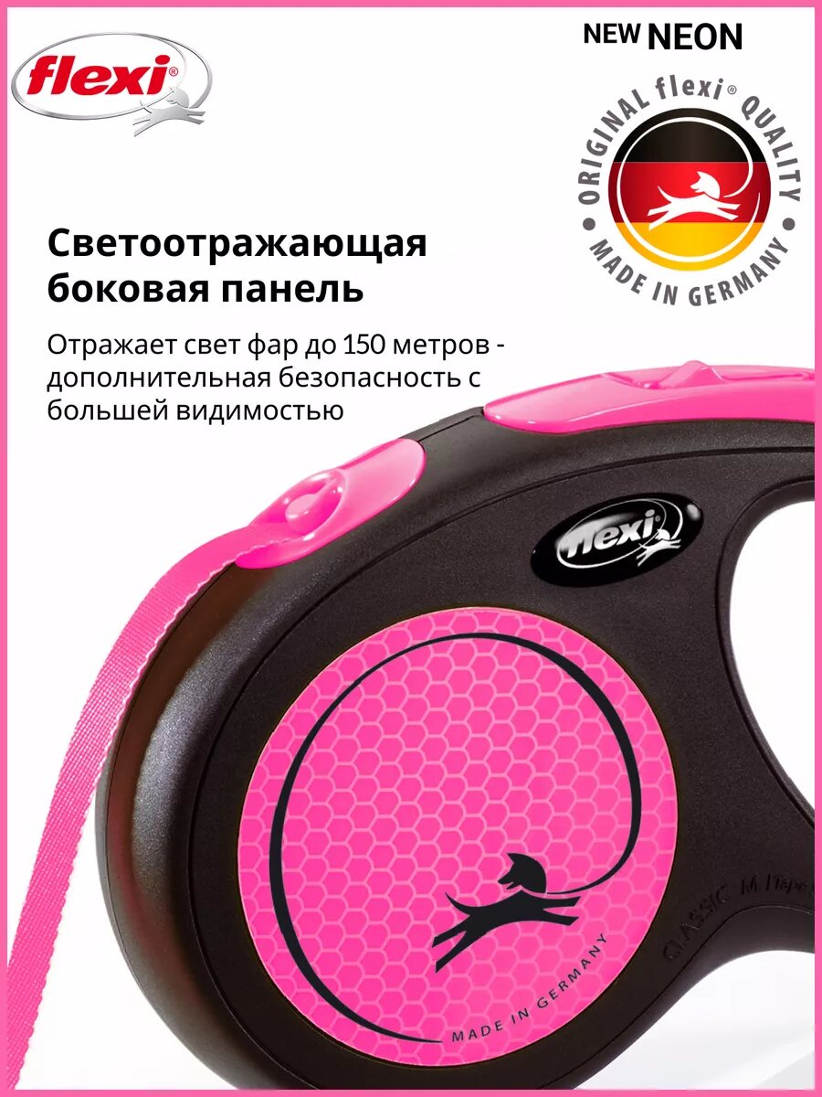 Поводок-рулетка Neon New Classic M (до 25 кг) лента 5 м, светоотражающая,розовый неон