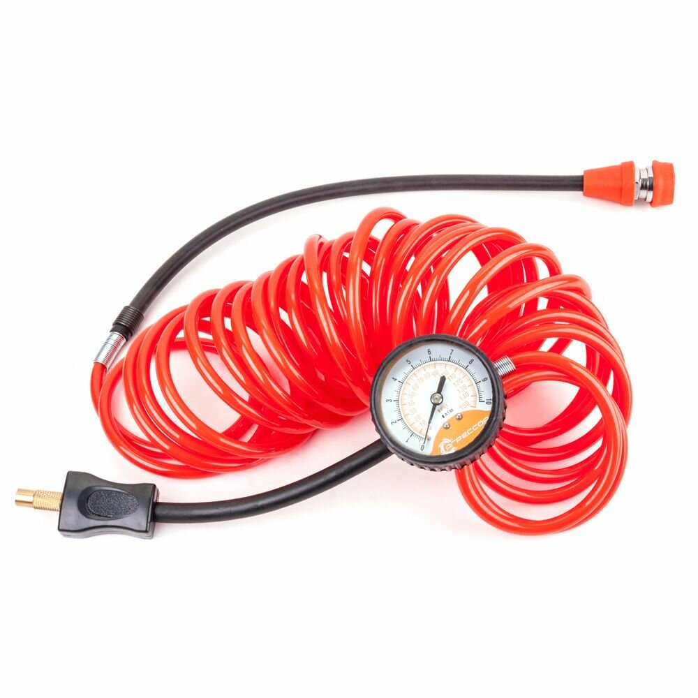 Длинный шланг и время работы позволяет один раз подключить компрессор и без лишних движений накачать все колёса. Манометр достаточно точный (сзади кнопка для сброса давления в шланге чтобы посмотреть сколько уже накачано) |