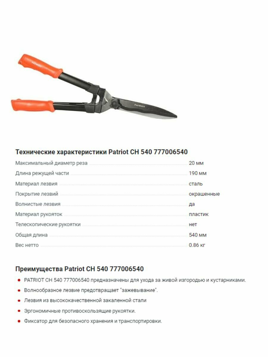 Ножницы для живой изгороди PATRIOT CH 540, волнообразное лезвие, 540 мм PATRIOT 777006540 №1067
