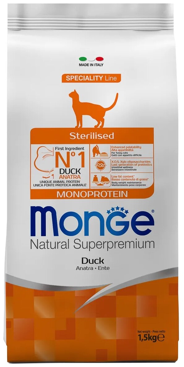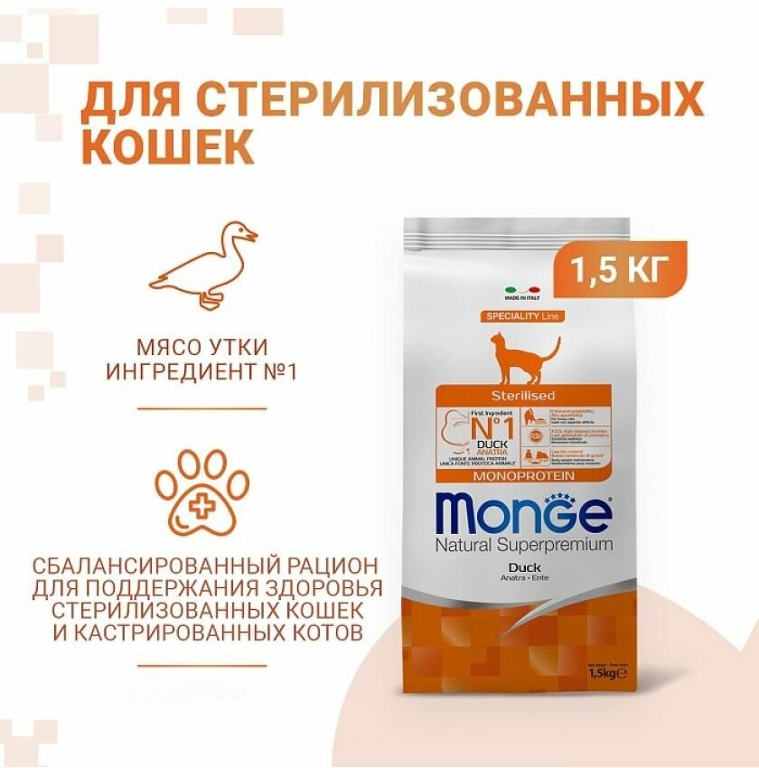 Корм сухой Monge Cat Monoprotein для взрослых стерилизованных кошек, с уткой, 1.5 кг