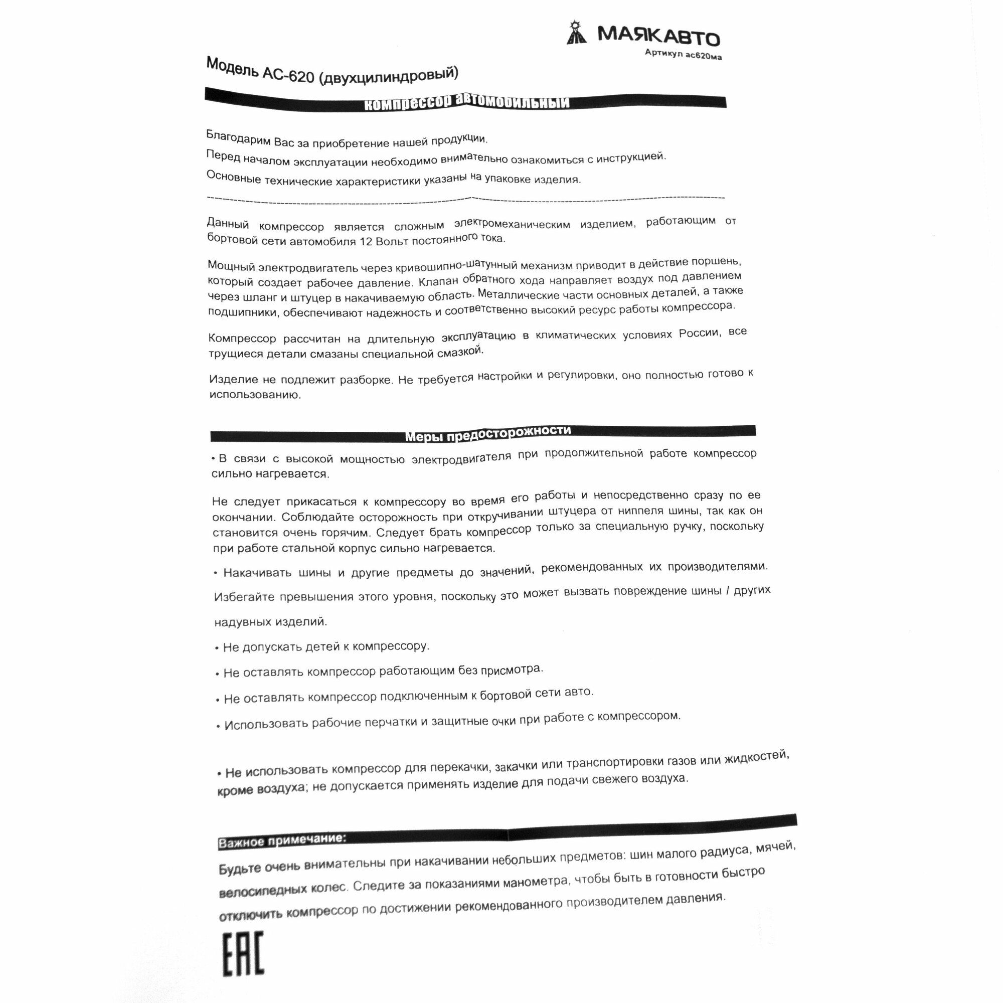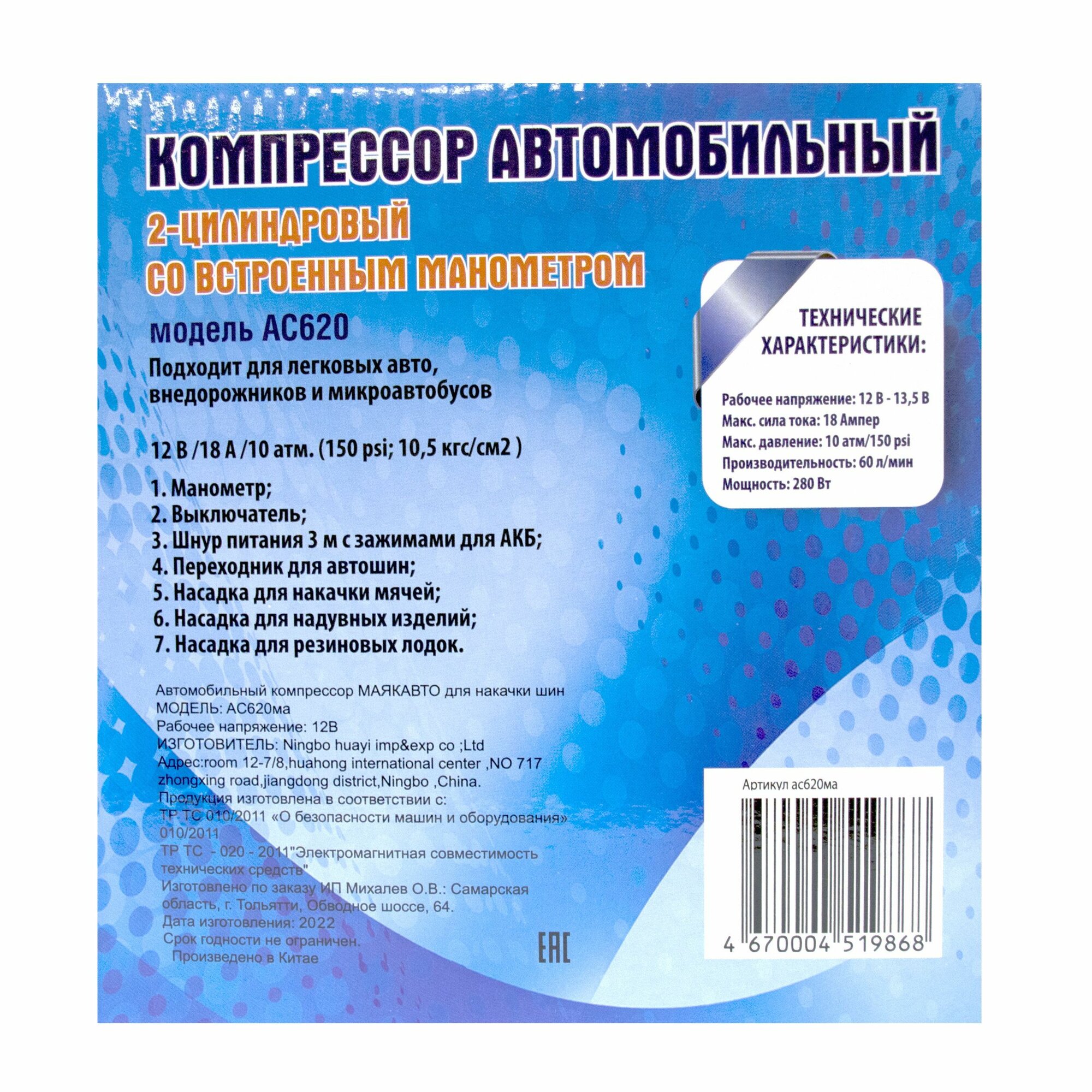Компрессор автомобильный МаякАвто АС 620ма 2-поршневой усиленный 1/6_ ас620ма