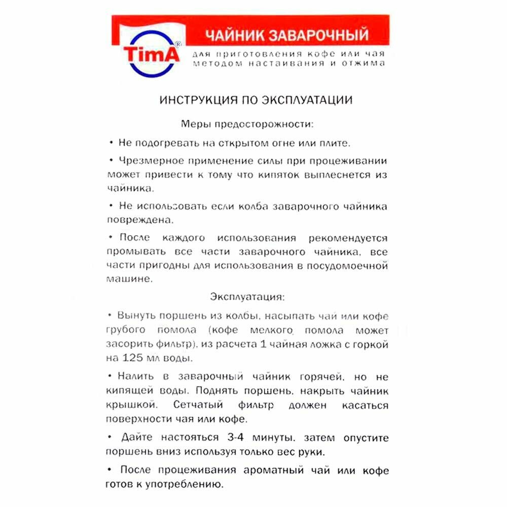 Френч-пресс TimA FG-350 "Наполеон" 350 мл нержавеющая сталь, боросиликатное стекло