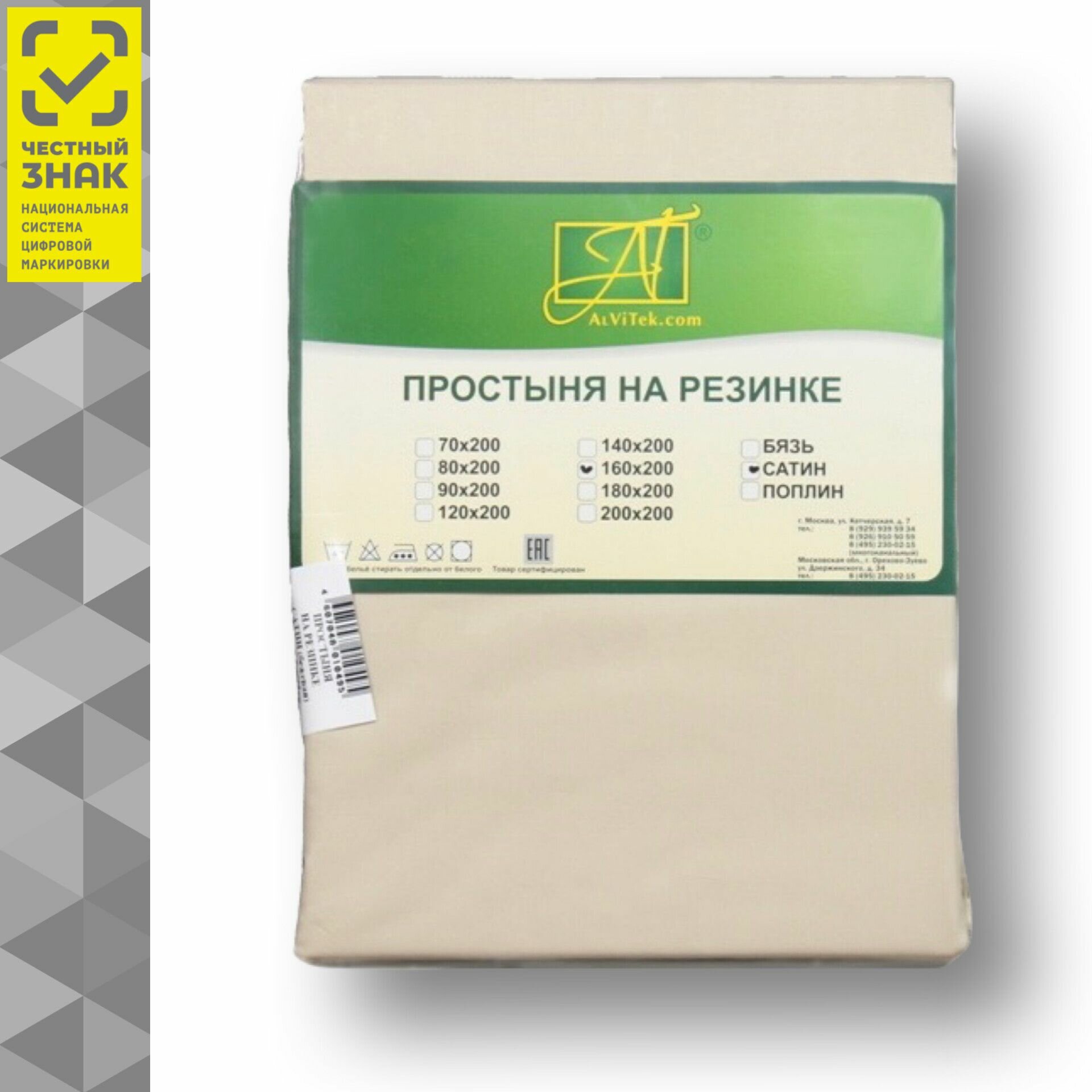 Простынь на резинке AlViTek (АльВиТек) 90х200х25, 1,5 спальная, Натяжная, Сатин, 100% хлопок, Цвет бежевый, AALV-ПР-СО-Р-090-БЕЖ