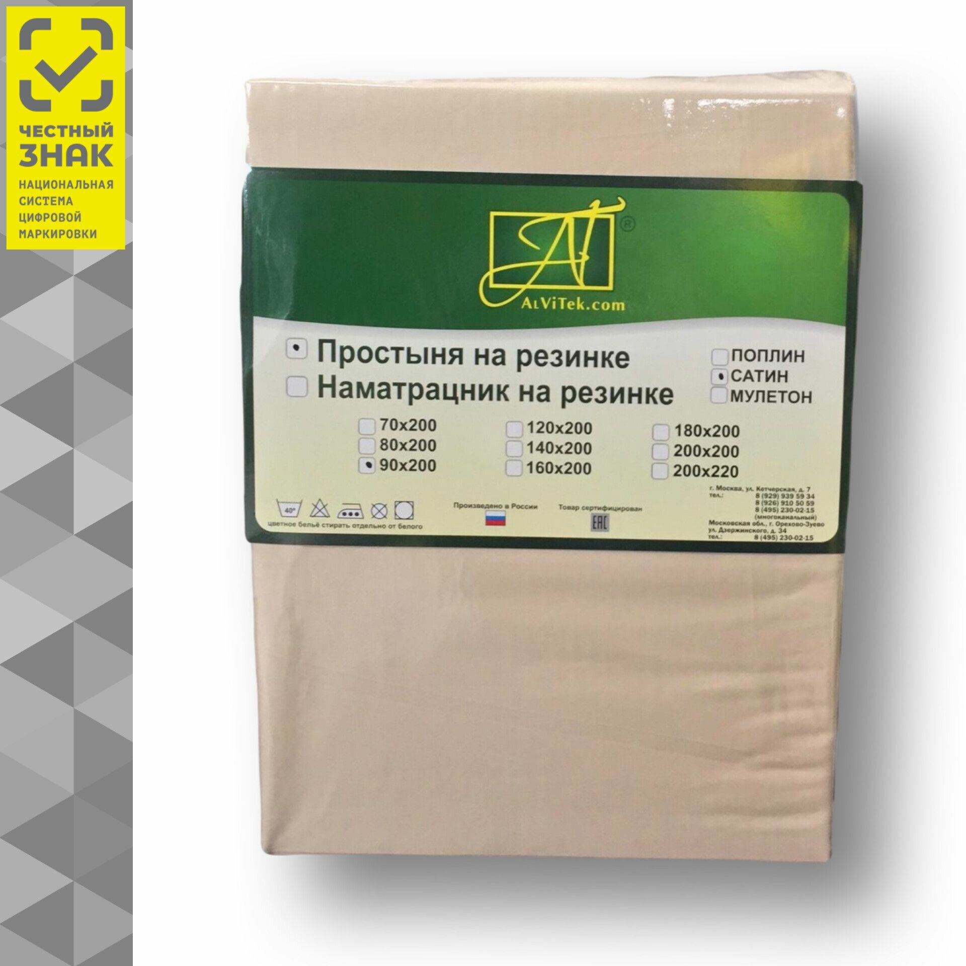 Простыня на резинке Альвитек, 090х200x25, ткань 100% хлопок Сатин, цвет Бежевый, арт. ПР-СО-Р-090-БЕЖ