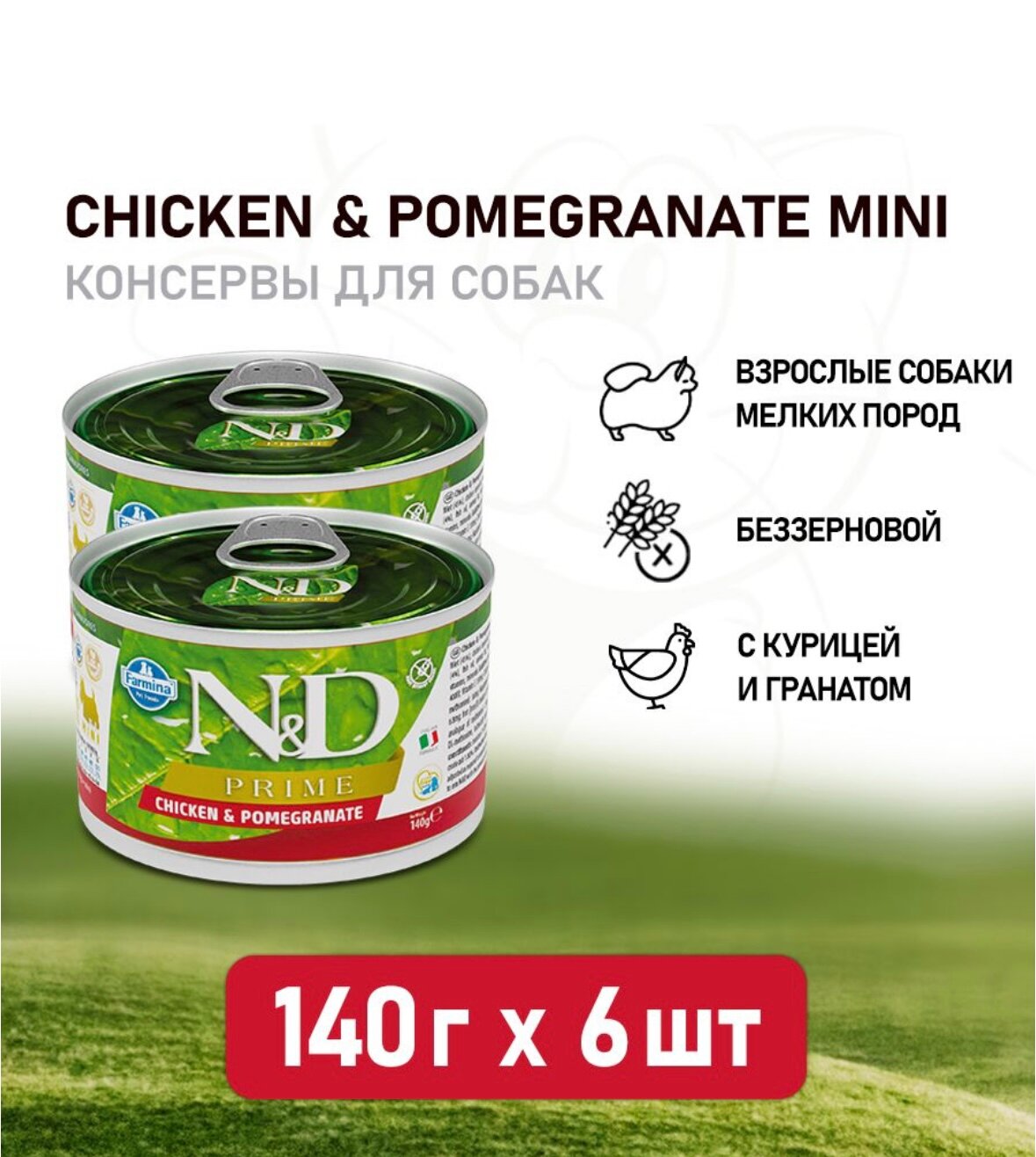 Farmina N&D Prime Dog Mini влажный беззерновой корм для взрослых собак мелких пород с курицей и гранатом - 140 г (6 шт в уп)