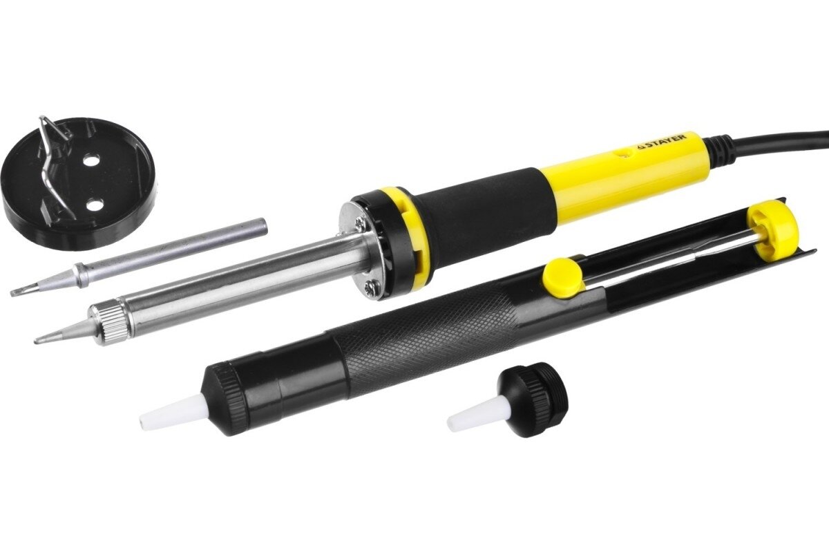 Набор для паяльных работ STAYER 60Вт с 2К рукояткой, конус, подставка+припой+сменное жало+оловоотсос+сменная насадка, PROTerm