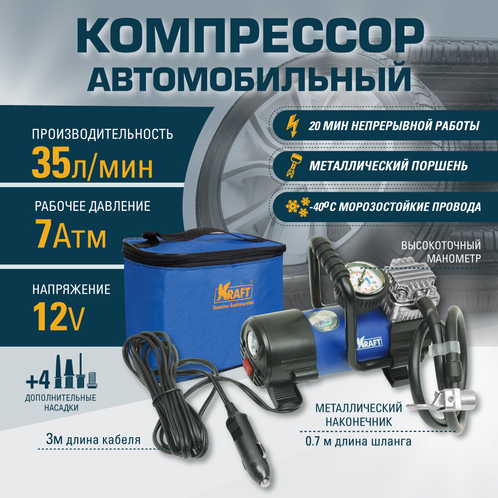 Компрессор kraft 12v, 15 a, 7 атм, 35 лмин, предохр-ль, сумка, KRAFT KT800027 (1 шт.)