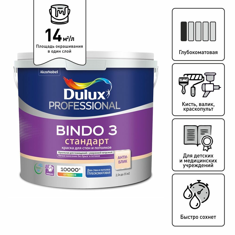 Dulux Professional Bindo 3 Водно-дисперсионная краска для стен и потолков (под колеровку, глубокоматовая, база BC, 2,25 л)