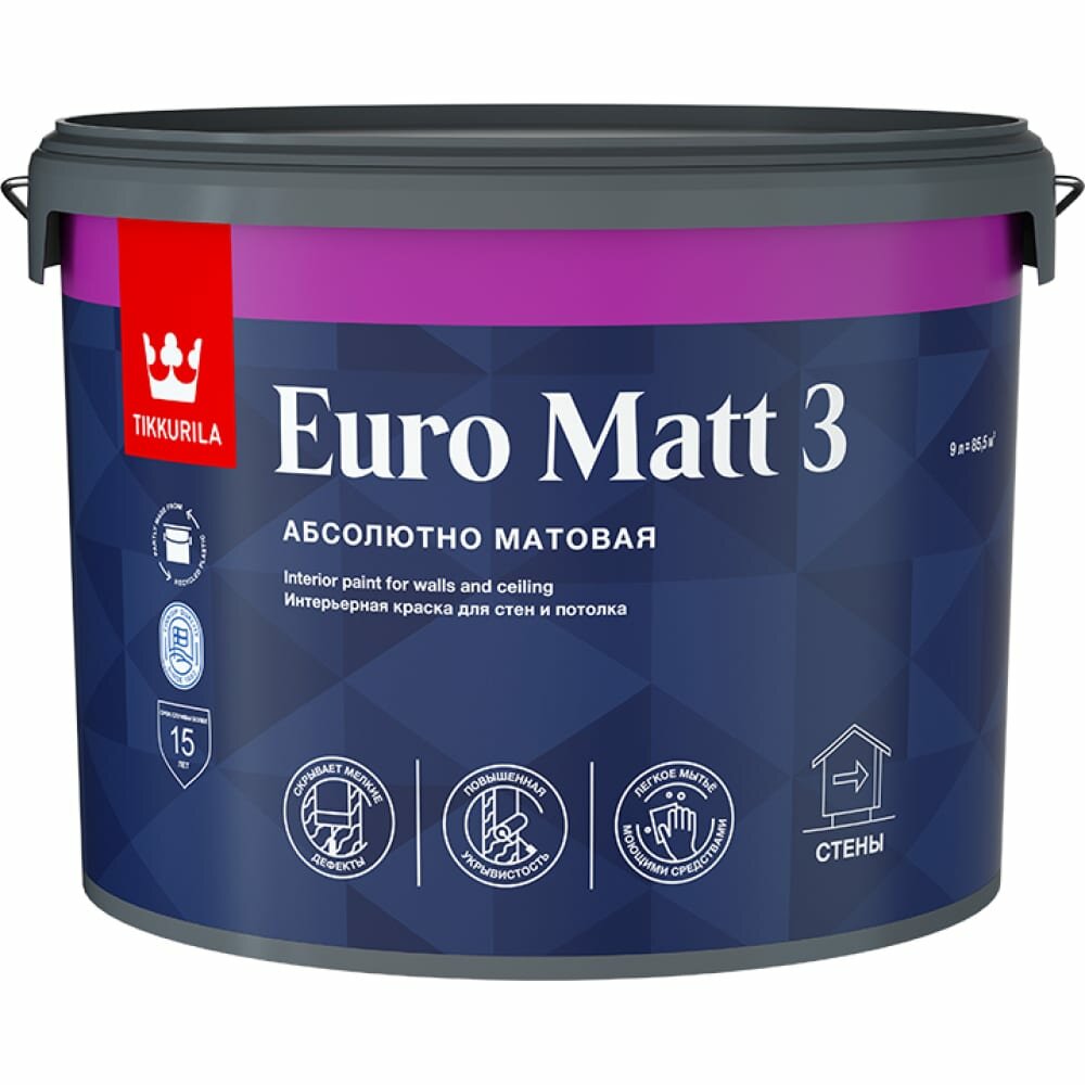 TIKKURILA EURO MATT 3 краска интерьерная для стен и потолков, абсолютно матовая, база C (9л)