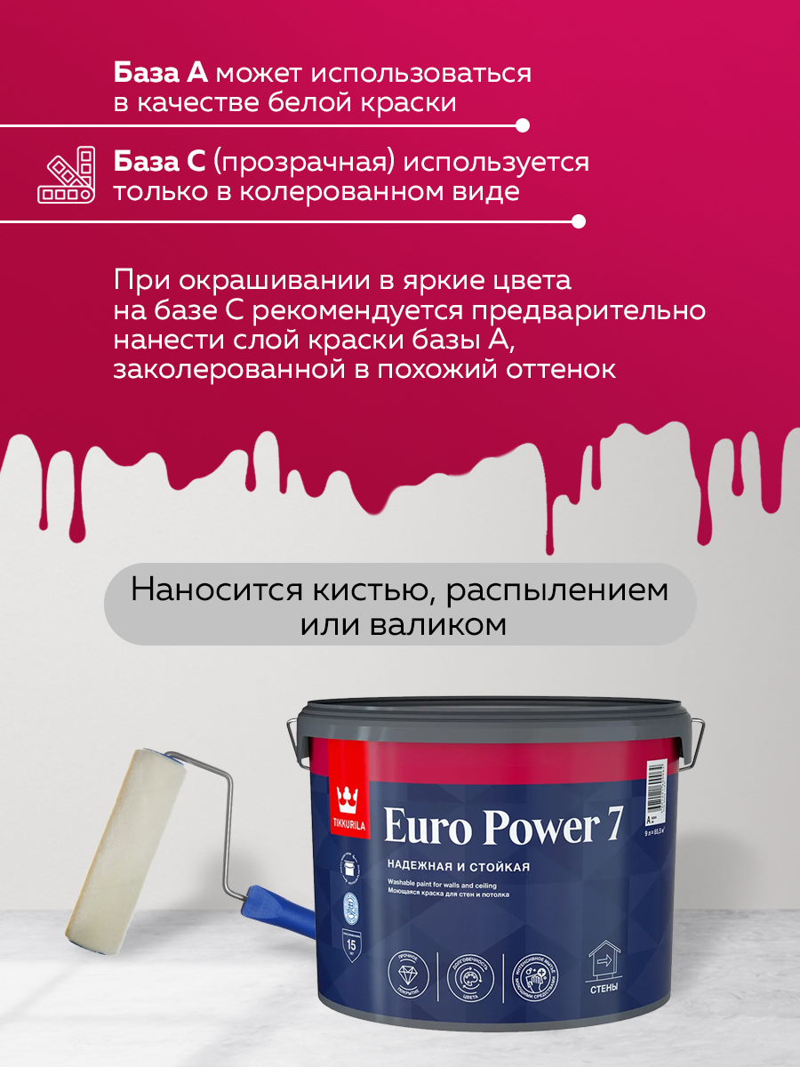 Tikkurila Euro Power 7 моющаяся краска для стен и потолков (под колеровку, матовый, база C, 9 л)