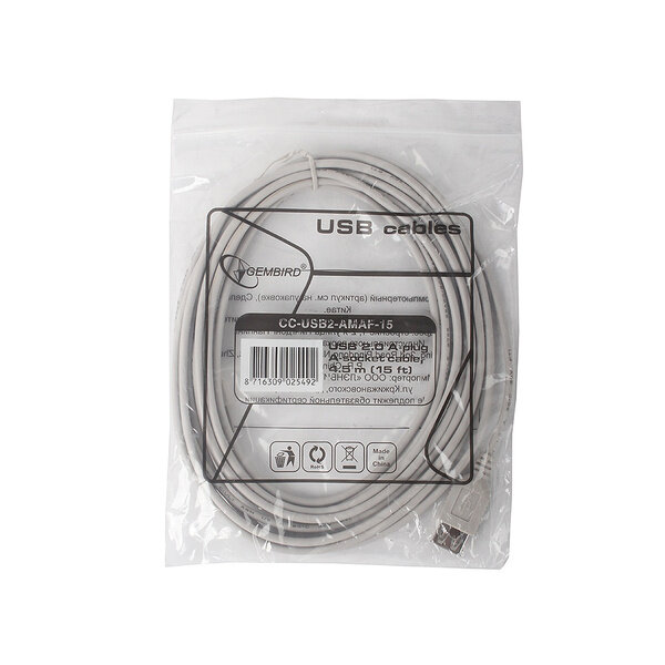 Gembird кабели CC-USB2-AMAF-15 USB 2.0 кабель удлинительный 4.5м AM AF , пакет