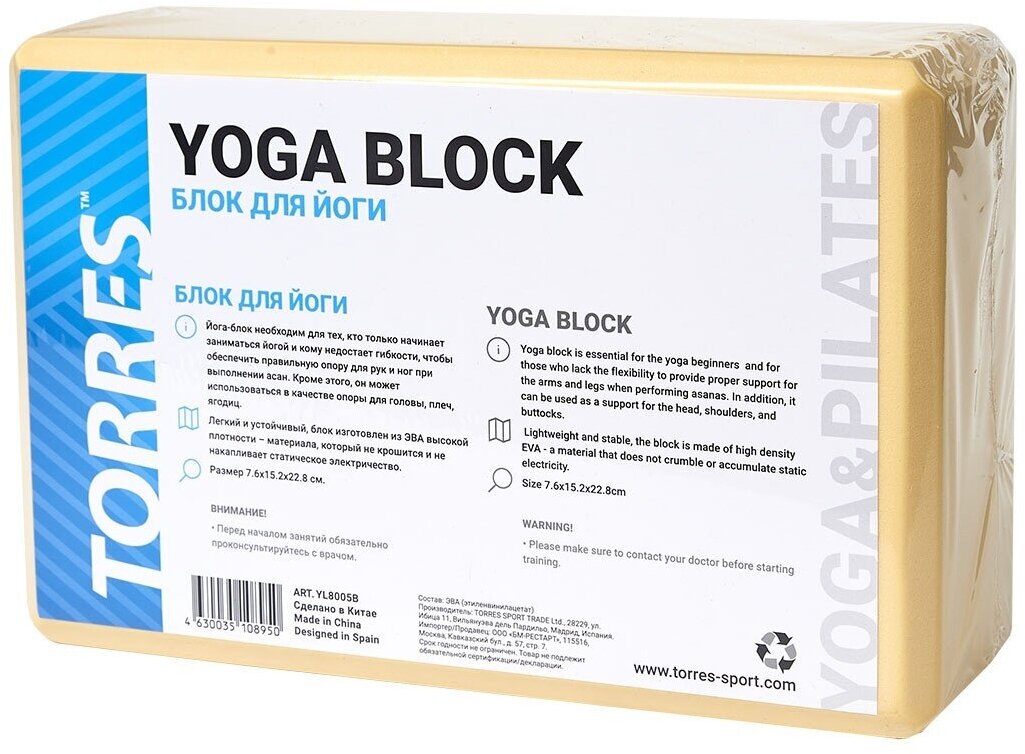 Блок для йоги Torres Yl8005b, размер 8x15x23 см, материал Эва, песочный .
