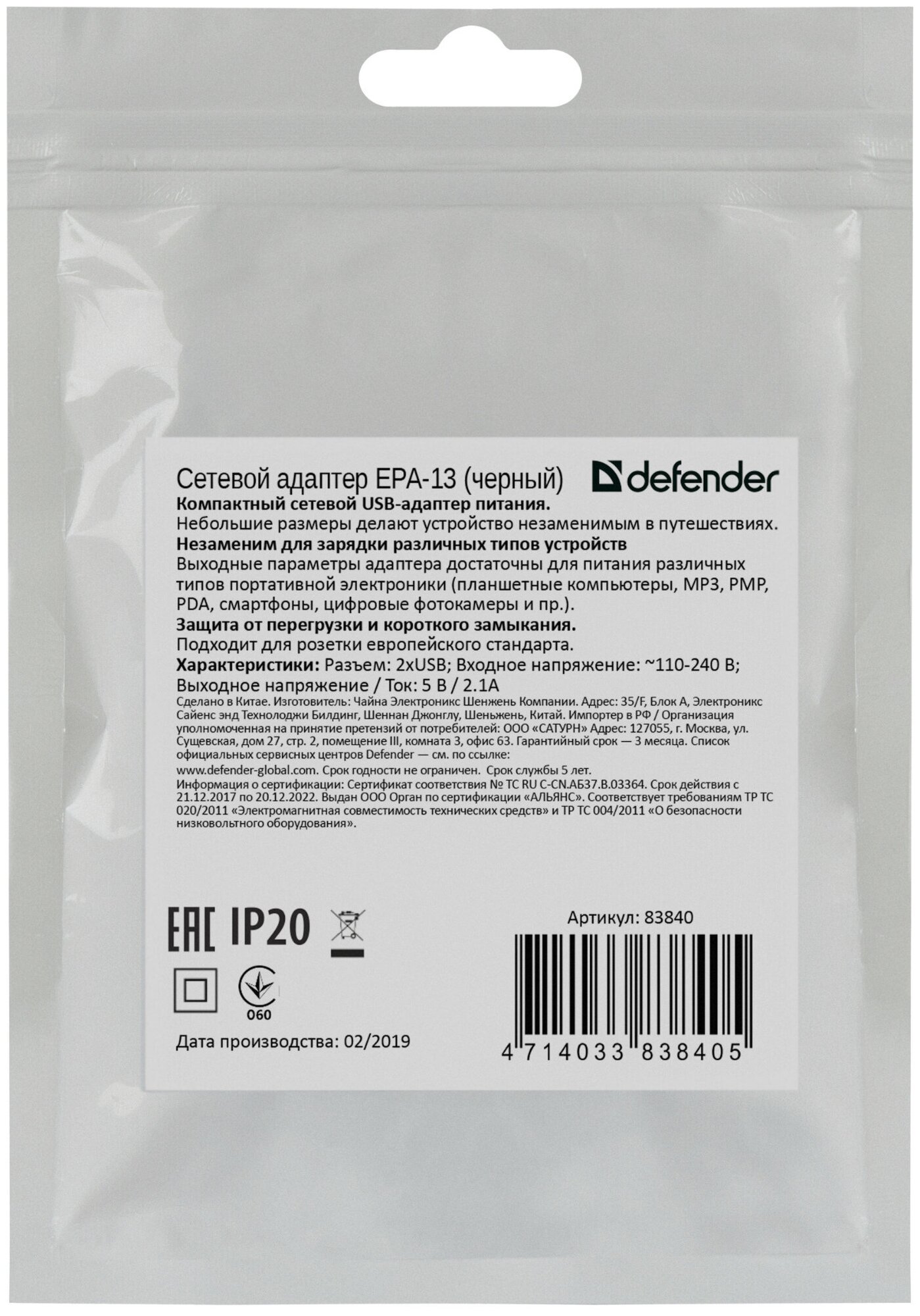 Defender Сетевой адаптер 2xUSB, 5V 2.1А, черный, пакет EPA-13 83840