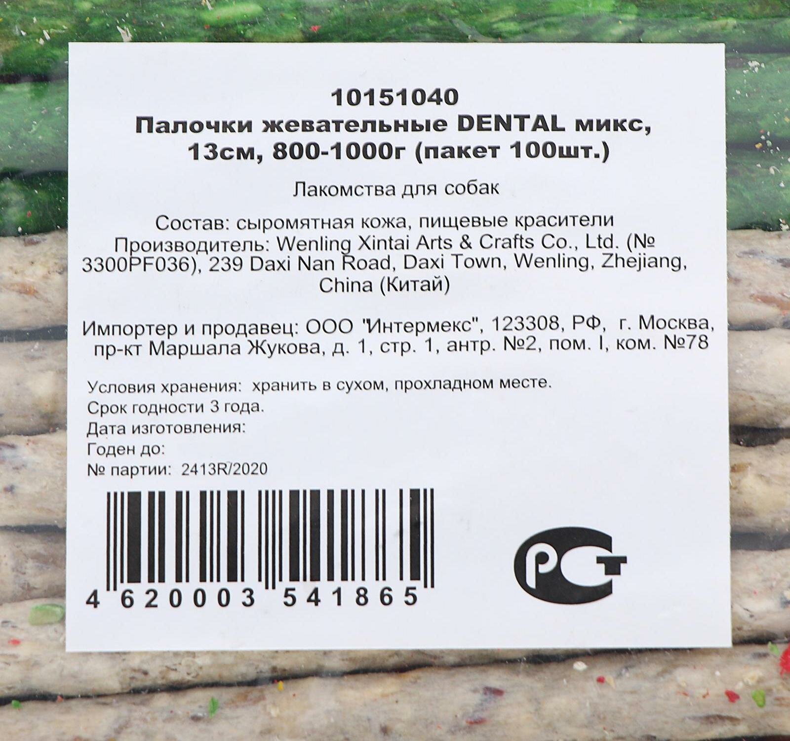 Палочки жевательные DENTAL микс, 13см, 800-1000г (пакет 100шт.)