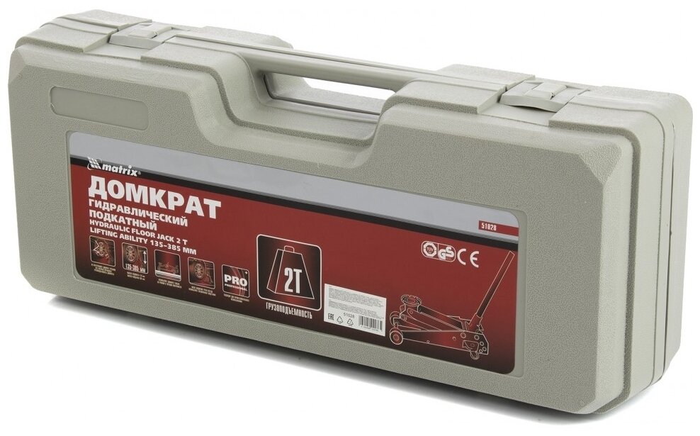 Домкрат гидравлический подкатный, 2 т, высота подъема 135-385 мм, в пластиковый кейсе MATRIX 51028