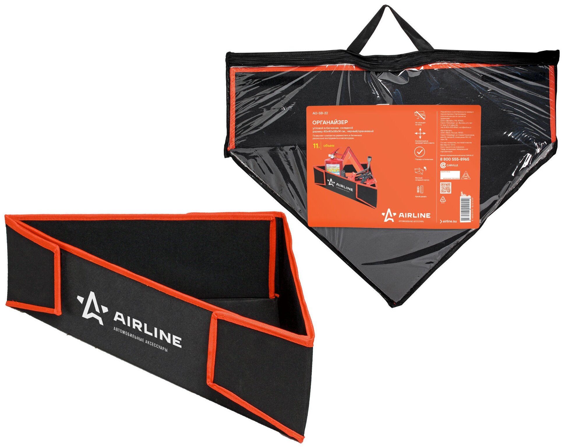 AIRLINE AOSB22 AO-SB-22_органайзер! угловой в багажник, складной 400x400x580x140 мм (11л) цвет черный/оранжевый\