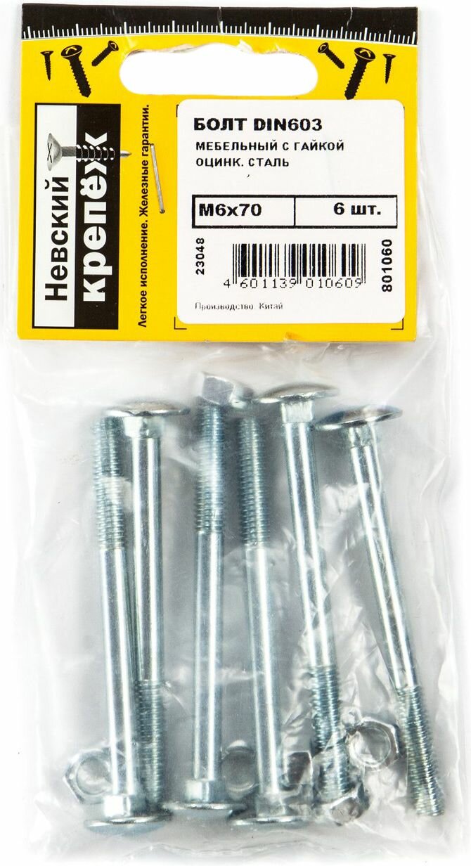 Болт DIN 603 Невский крепеж полукруглый М6x70 мм с гайкой 6 шт