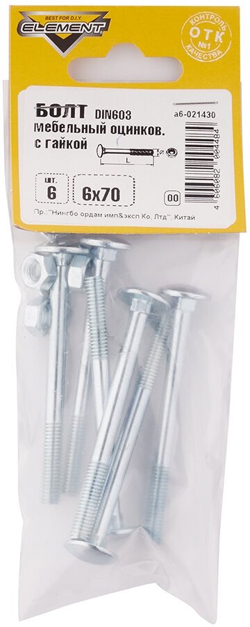 Болт мебельный Element, DIN603, 6х70 мм, с гайкой, оцинкованный, на блистере 6 шт., 2 штуки