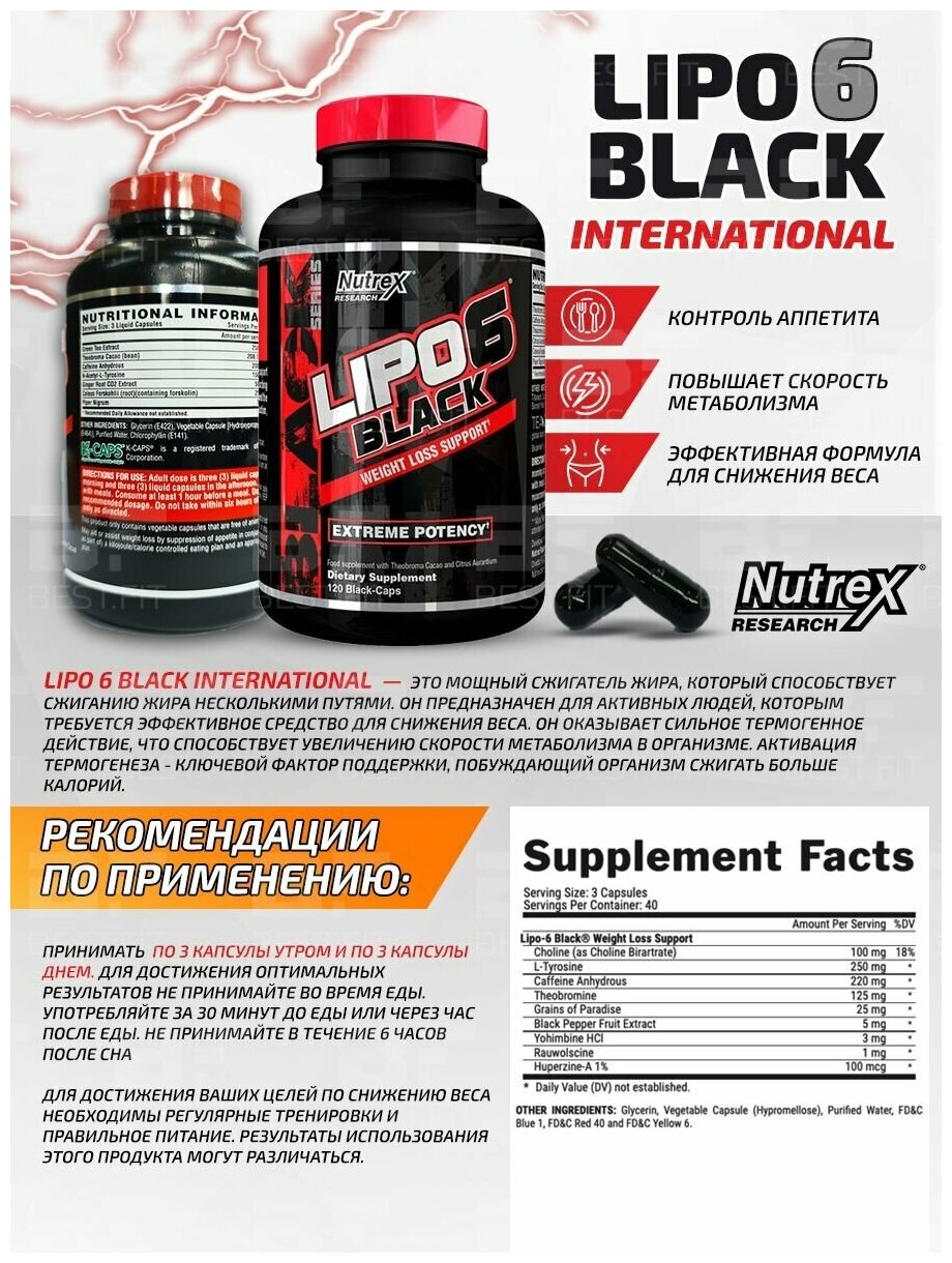 Lipo-6 Black: - Стимулирует центральную нервную систему (ЦНС); - Подавляет аппетит; - Активирует бета-адренорецепторы; - Ускоряет жиросжигательные процессы; - Усиливает синтез катехоламинов; - Вызывает чувство бодрости и хорошего настроения; - Создает ментальную концентрацию, необходимую для тренинга; - Увеличивает термогенез и теплопродукцию; - Ускоряет метаболизм; - Упрощает расщепление жиров в энергообмене. Количество порций - 40, одна порция - 3 капс Состав 1 порции: Фирменный комплекс - 504,5 мг: - Безводный кофеин - Бета-фенилэтиламин - Колеус форсколи (20% форсколин) - Advantra Z Померанец (50% синефрин) - Зингерон (Zingerone) - Йохимбин Ингредиенты: Глицерин, целлюлоза, вода, полисорбат 80, гипромеллоза, красители. Способ применения: Первый прием должен быть сразу после пробуждения или за 20-30 минут до завтрака. Второй прием добавки должен быть перед тренингом, за 30-40 минут до его начала. Постарайтесь выпивать капсулы на пустой желудок. Разовая порция при каждом употреблении – 3 капсулы, т.е. 6 капсул в сутки. Не используйте более 8-9 в течение 24 часов. В ином случае возможны негативные последствия. Курс приема добавки должен длиться 3-4 недели. Затем необходимо отдохнуть от неё в течение 10-14 дней, не употребляя при этом другие продукты, содержащие стимулирующие вещества, в первую очередь другие жиросжигатели и предтренировочные комплексы. Данный способ периодизации позволяет избежать толерантности к компонентам и различных побочных эффектов.?? |