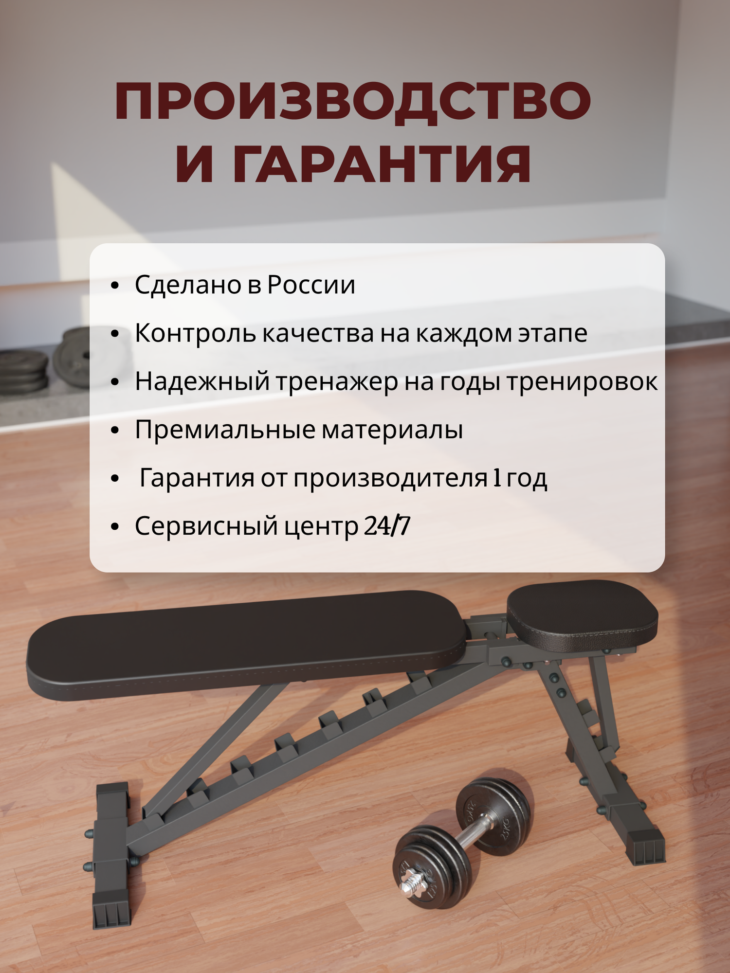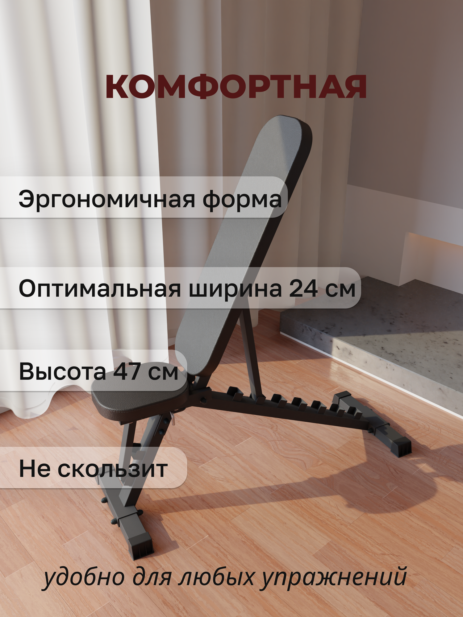 Не скользит Массу в 84 + вес гантелей в 36 кг выдерживает в наклоне При правильном сборке скрипов нет. Легко разбирается и не занимает много места, что удобно для небольших квартир. |