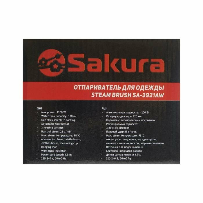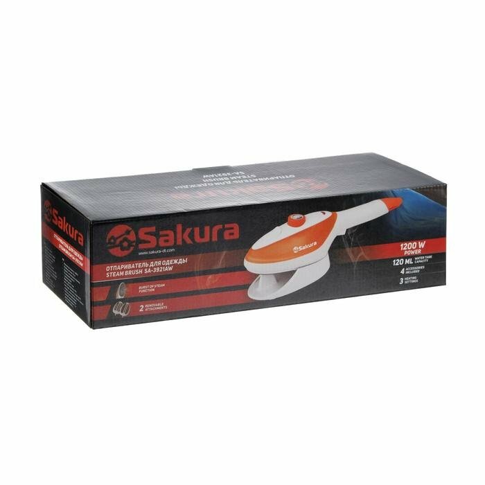 Отпариватель-щётка Sakura SA-3921AW, ручной, 1200 Вт, 3 режима, 2 насадки, 120 мл, 25 г/мин