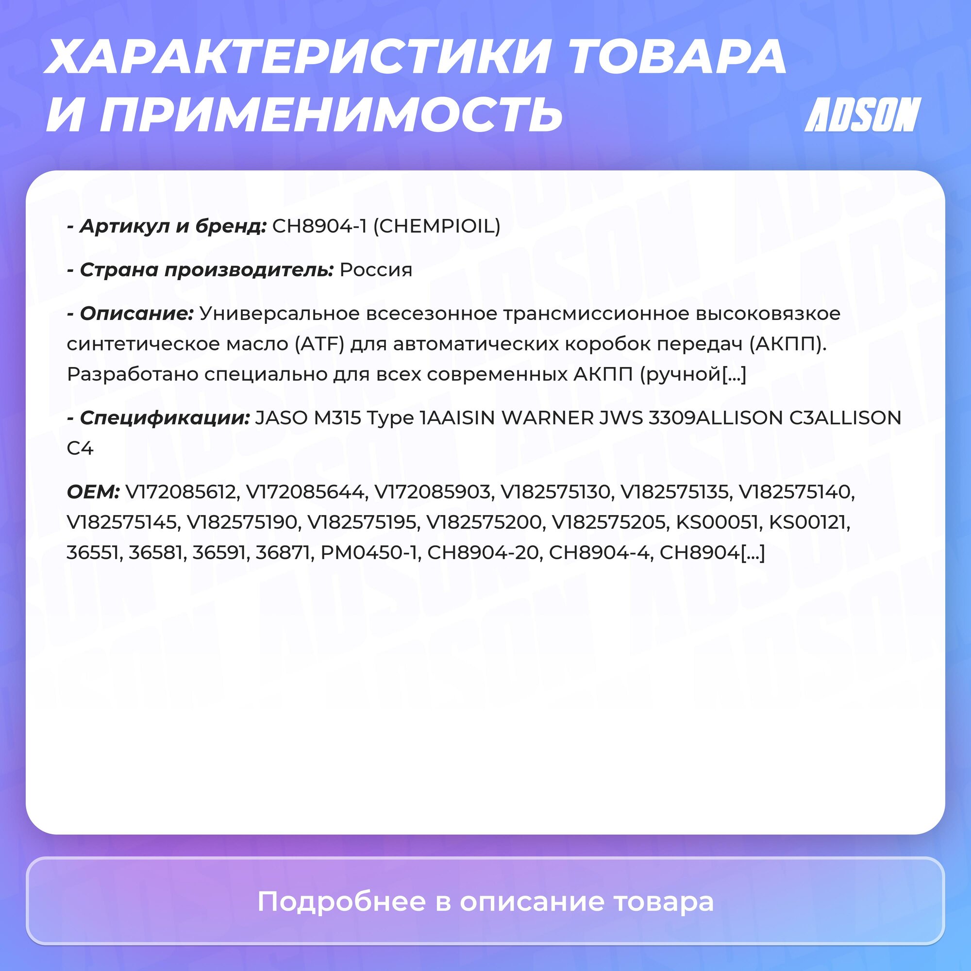 СохранитьMulti ATF 1л (авт. транс. синт. масло) CHEMPIOIL CH8904-1 интересное: