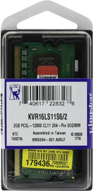 Модуль памяти Kingston DDR3L SO-DIMM2Gb 1600МГц CL11 (KVR16LS11S6/2), 1583905