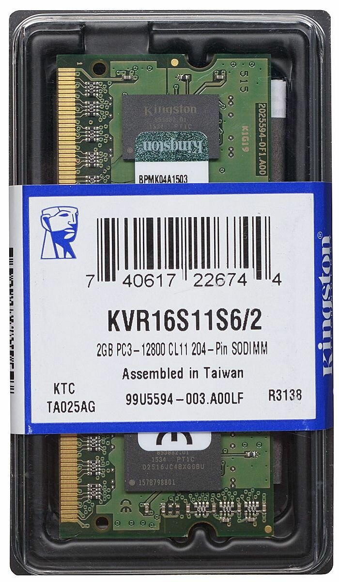 Оперативная память Kingston ValueRAM 2GB DDR3 SO-DIMM PC3-12800 (KVR16LS11S6/2)