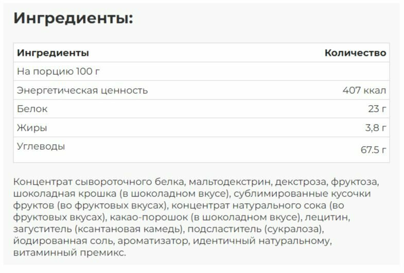 | Отзыв: | Рабочий продукт, при интенсивных нагрузках набирается вес, без отложения жира. В составе гейнера присутствуют кусочки фруктов |