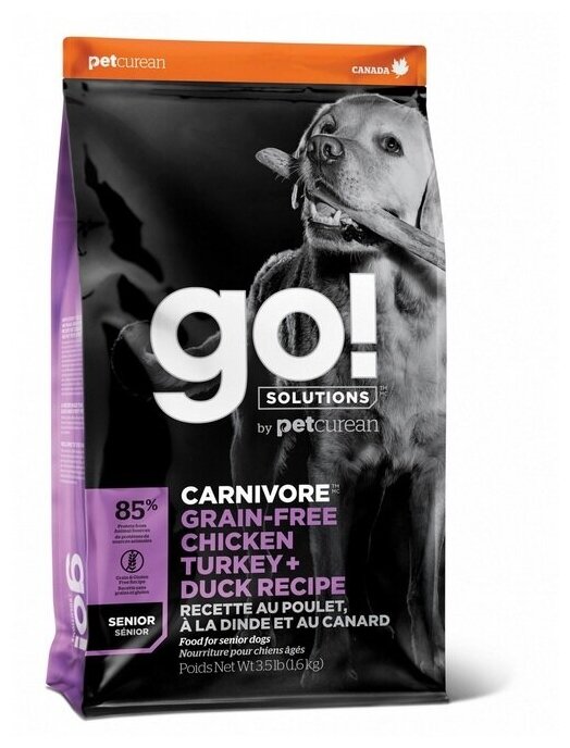 Корм сухой GO! CARNIVORE Senior для пожилых собак всех пород, 4 вида мяса: Индейка, Курица, Лосось, Утка 1,6кг