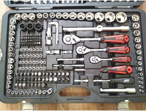 Качественный кейс с 4 застежками Головки для пневмо-инструмента прекрасны. 3 трещетки, с хорошим мелким ходом приятны в работе. Много мелких насадок для электроники, таких я не видел нигде. Все предметы фиксируются отлично, даже на нижней части. Можно не бояться перевернуть, ничего не выпадет. |