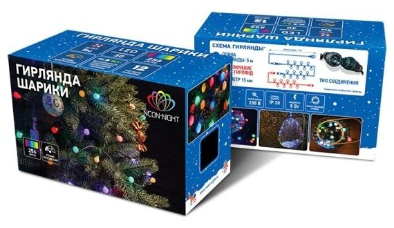 Гирлянда украшение новогоднее светодиодная Мультишарики Neon-night диаметр 23 мм, длина 10 м, черный ПВХ, 80 LED диодов, цвет свечения разноцветное RGB